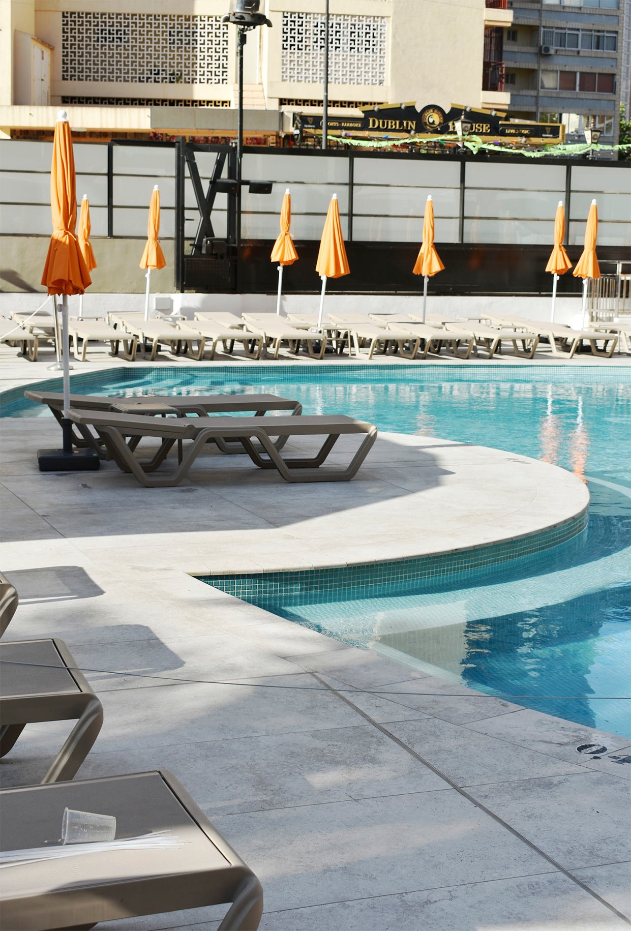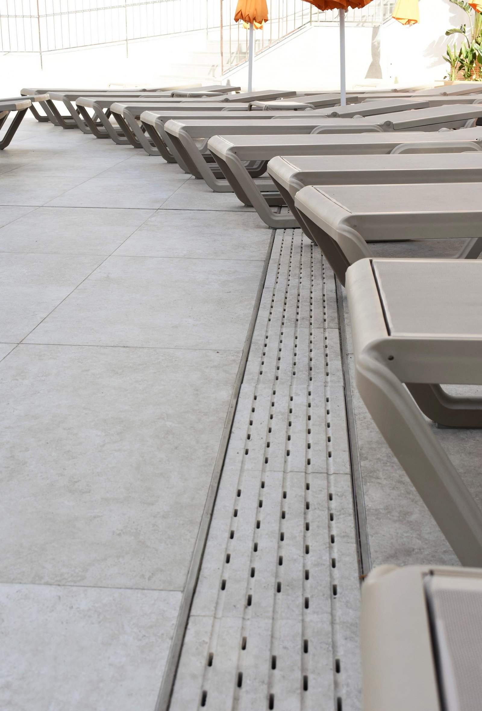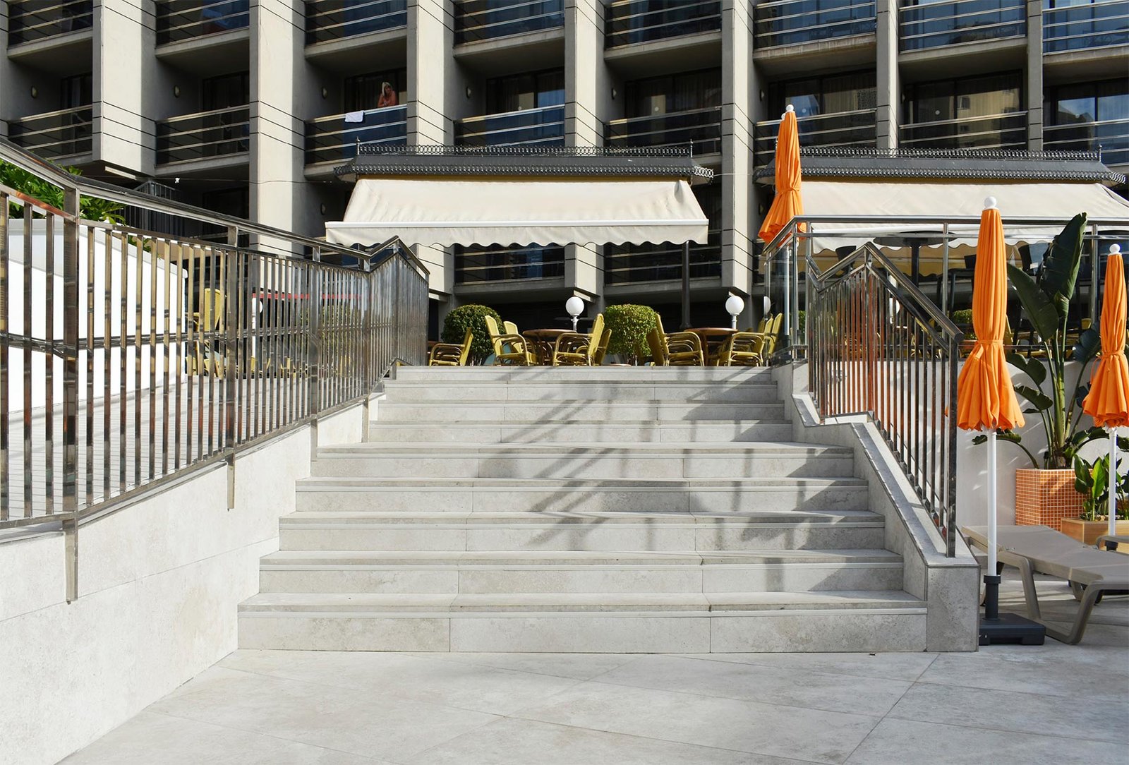 El Hotel Marina se situa a escasos metros de la playa de Benidorm. Para su reforma exterior emplearon el color Crosscut Cloud, que armonizaba con todos los espacios exteriores del hotel. Las piezas especiales utilizadas fueron el borde Creta de 33x50cm, la rejilla de drenaje RJ67 de 25x50cm y los peldaños rectos de gran formato 33x120cm para todas las escaleras.