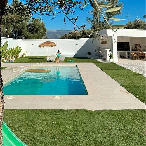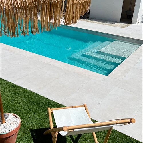 El mismo acabado se ha aplicado tanto en la terraza como en la zona de piscina, incluyendo nuestros peldaños cerámicos especialmente diseñados para garantizar seguridad y continuidad visual. El resultado es un conjunto armónico y duradero que conecta todas las zonas exteriores con una estética uniforme y elegante.